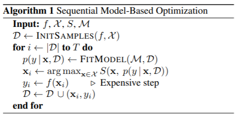 (1) 准备输入: expensive blackbox function ,超参搜索空间 ,采样数据集 (超参组合 ,对应 输出值),采集函数